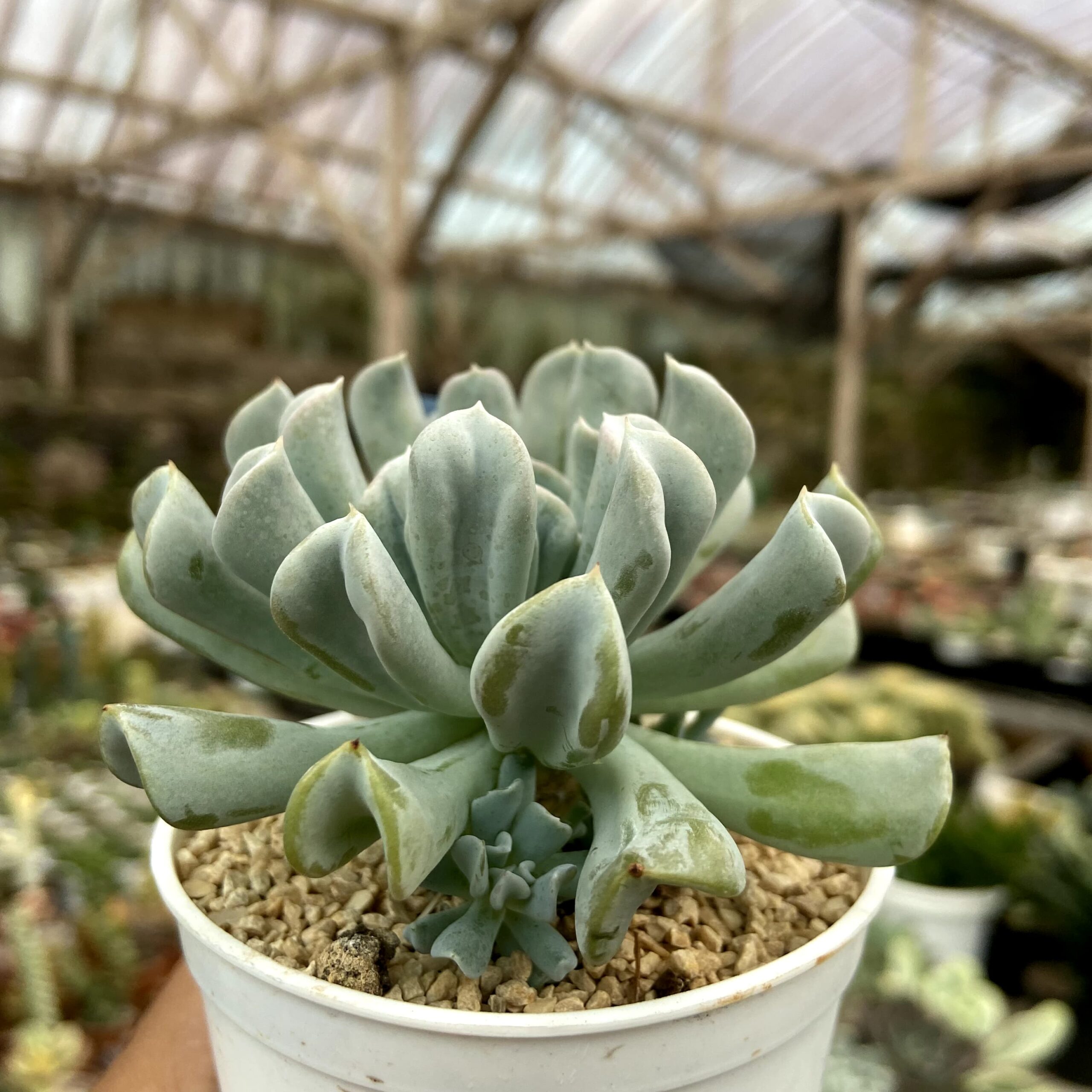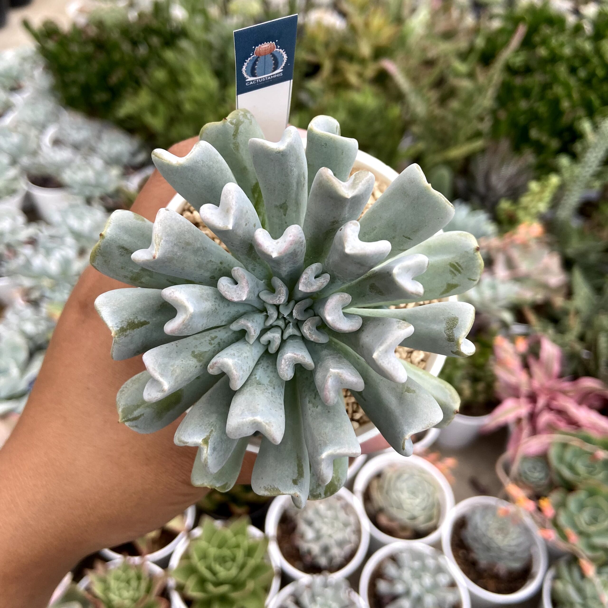 Echeveria Topsy Turvy adalah kultivar sukulen populer dari Echeveria runyonii, dikenal dengan roset daunnya yang unik berwarna biru keabu-abuan dengan tepi melengkung ke bawah dan ujung mengarah ke dalam, menciptakan tampilan “terbalik”